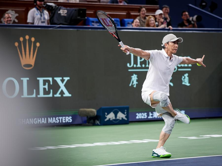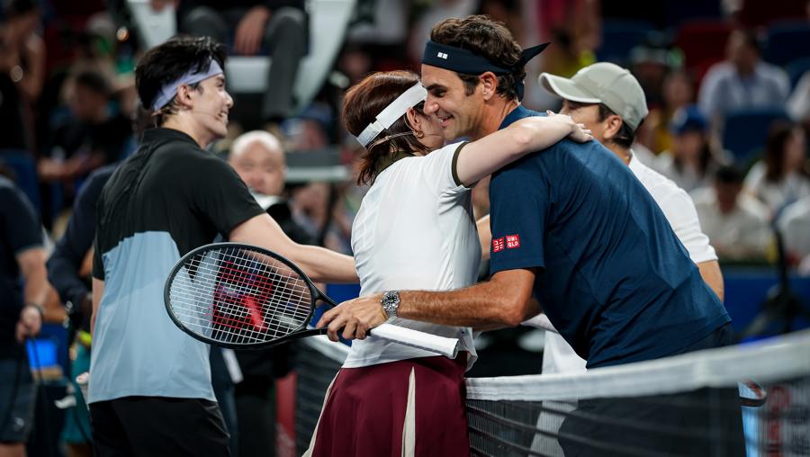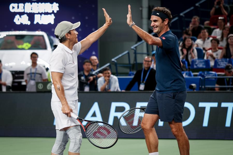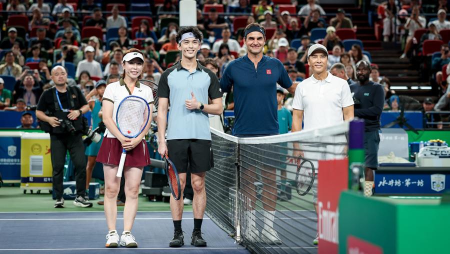 費德勒攜手國際動作巨星甄子丹、實力演員吳磊及中國金花網壇名宿鄭潔,爲現場觀衆獻上了一場驚喜雙打秀。