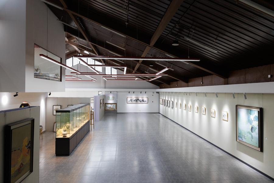 現代會議廳與靜謐茶室相得益彰,專設的畫室成爲藝術家創作基地。“主展廳正在展出‘吳愛政荷花藝術展’,主題是在蓮湖村隨處可見的荷花”,黃閏生介紹說,蓮湖村物產豐饒,菱角、大米、荷花、石橋、水杉……數不盡的風物,隨着季節變化,可以提煉出各種各樣的藝術表達,美術館不僅能爲本土藝術家提供展覽空間,更能成爲靈感迸發落地的地方。