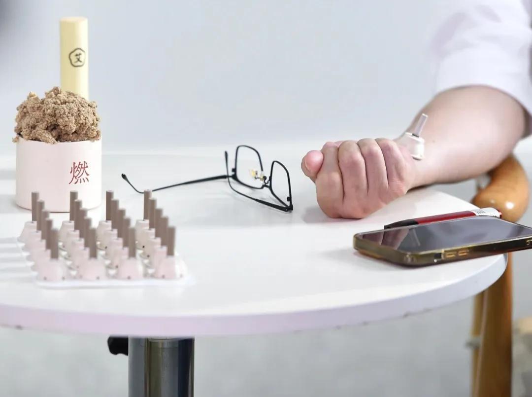 蘄春艾灸療法國家級非遺傳承人韓善明點燃兩根艾條,然後輕放置於吳老師脈搏的上方。