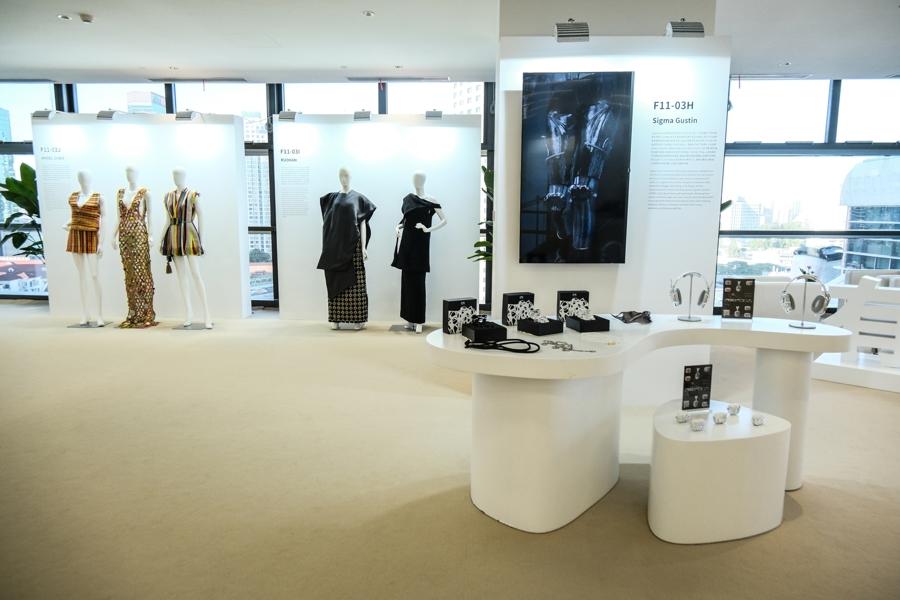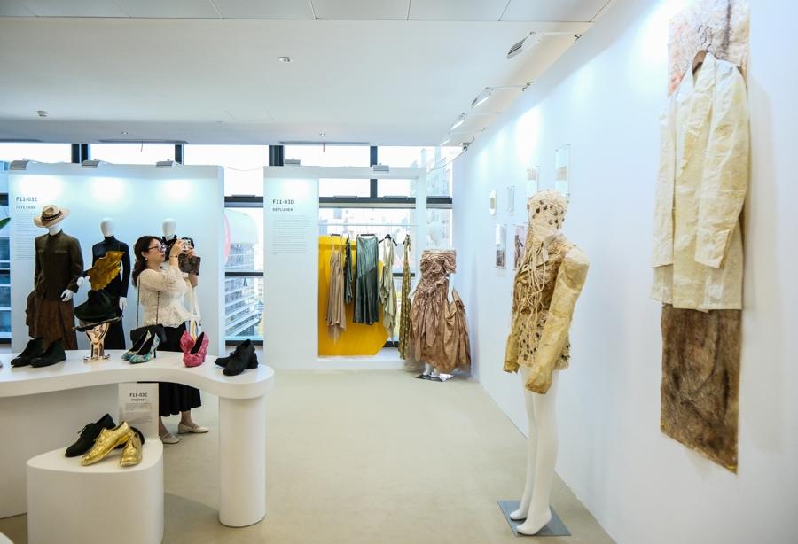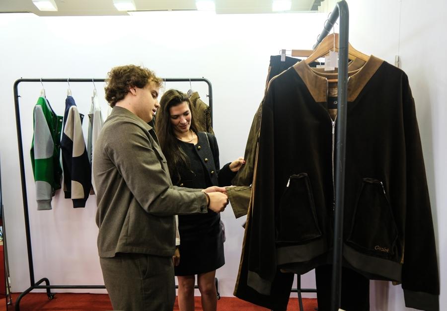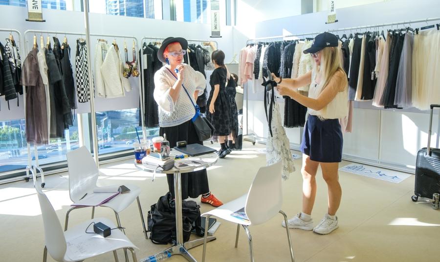 一家來自瑞士的服裝品牌帶來最新的服飾設計,主理人正在向買手介紹面料細節。