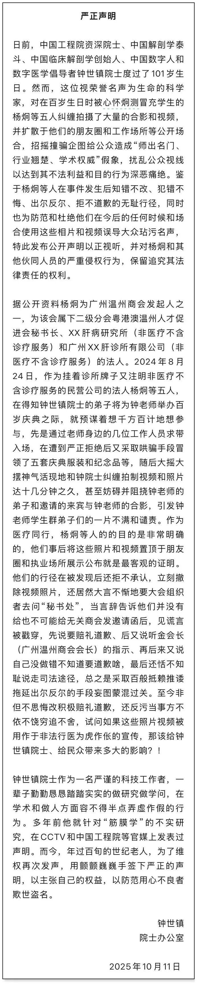我國解剖學泰斗、中國工程院院士、中國臨牀解剖學創始人、中國數字人和數字醫學倡導者鍾世鎮院士辦公室10月11日發佈由百歲院士手書籤字並委託發佈的嚴正聲明一份。