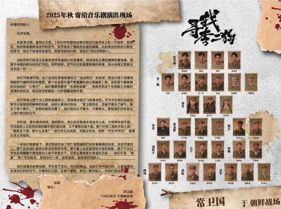 音樂創作上,《尋找李二狗》既保留沂蒙山小調、陝北民歌等的傳統民族韻味,又以現代編曲手法貼近年輕觀衆的審美。有衝鋒號角化作重金屬音樂震顫耳膜,也有《家書》《長眠》等唱段的細膩旋律勾勒戰火中的個體命運,成爲推動劇情、塑造人物的關鍵。