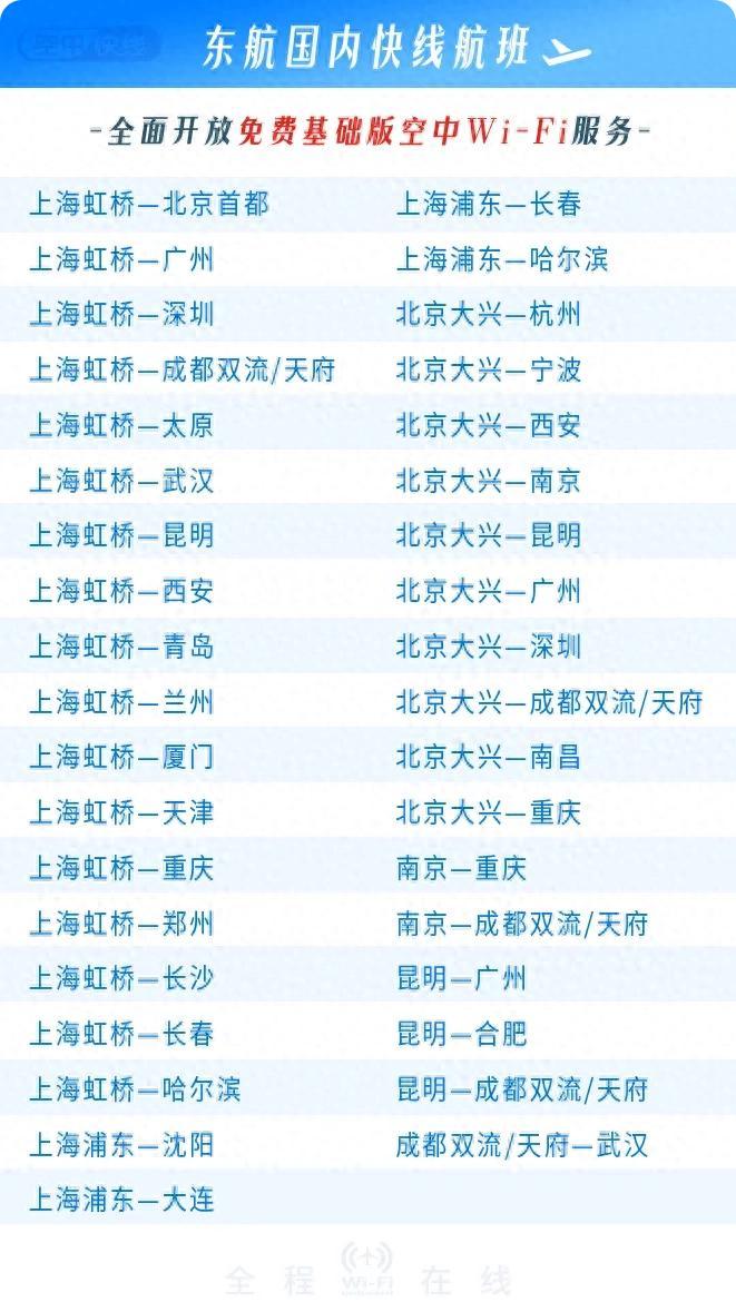 10月11日起,東航國內“空中快線”寬體機Wi-Fi全部免費,實現經濟艙全艙位免費版。 截至目前爲止,這是國內首家能大規模提供免費Wi-Fi服務的航空公司。