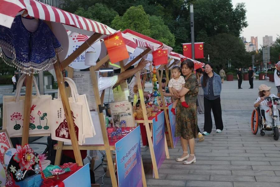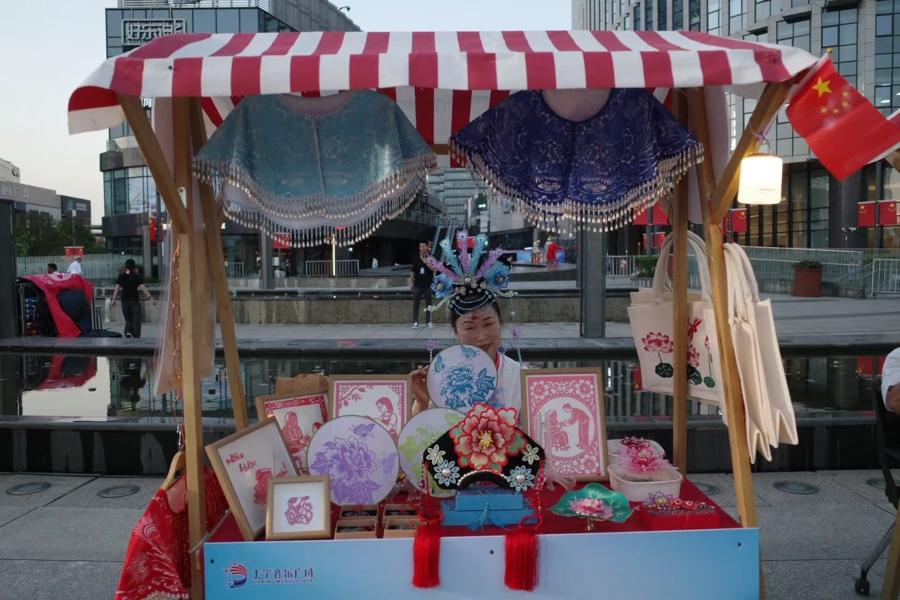 開幕舞臺旁的非遺手工市集,是本屆街藝節的又一亮點。絲帛剪紙創始人尤彩俠從帽子、漢服再到手中的團扇,皆由絲帛剪紙裝飾而成,“剪紙不僅能用紙張,亦可以用絲帛,可以用於各類生活場景,非常接地氣。”攤位上擺放有披肩、胸針、頭飾、團扇等,蝶類圖案生動,常有小朋友駐足。