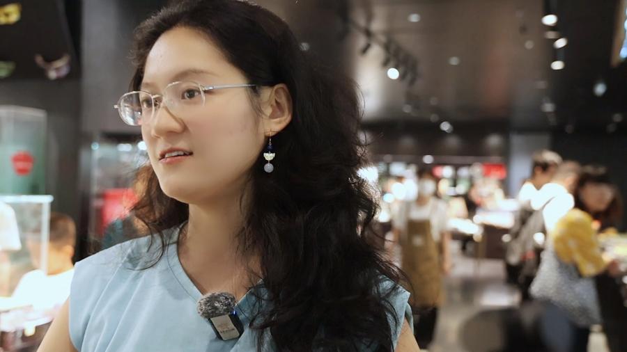 90後三星堆博物館文化產業部工作人員王泰睿愛美,她試戴了最新的蜀錦非遺三星堆耳環,還帶朋友來一起“種草”。