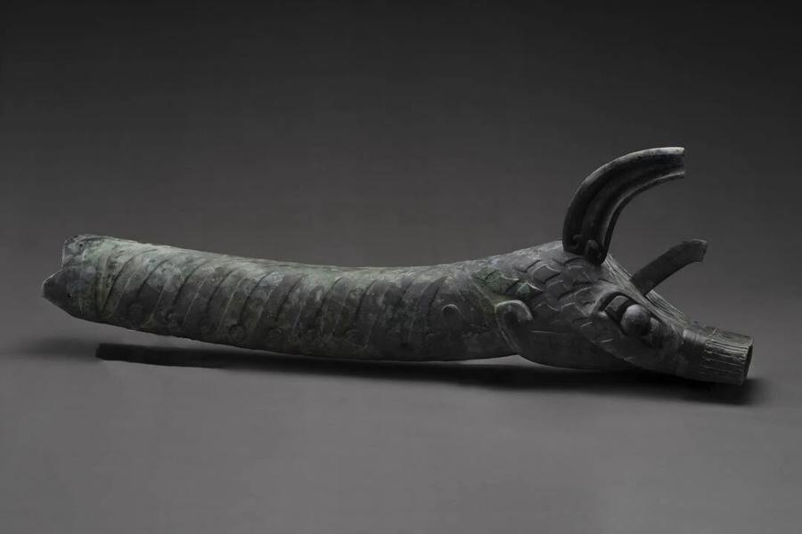龍形象也在三星堆遺存中頻繁出現,延續炎黃子孫共有的圖騰,又添上古蜀獨有的巧思。如青銅神樹上或緣樹而下、或昂首挺胸的神龍,鳥足神像青銅立人手中的龍首權杖,青銅大立人衣裳的龍紋樣……