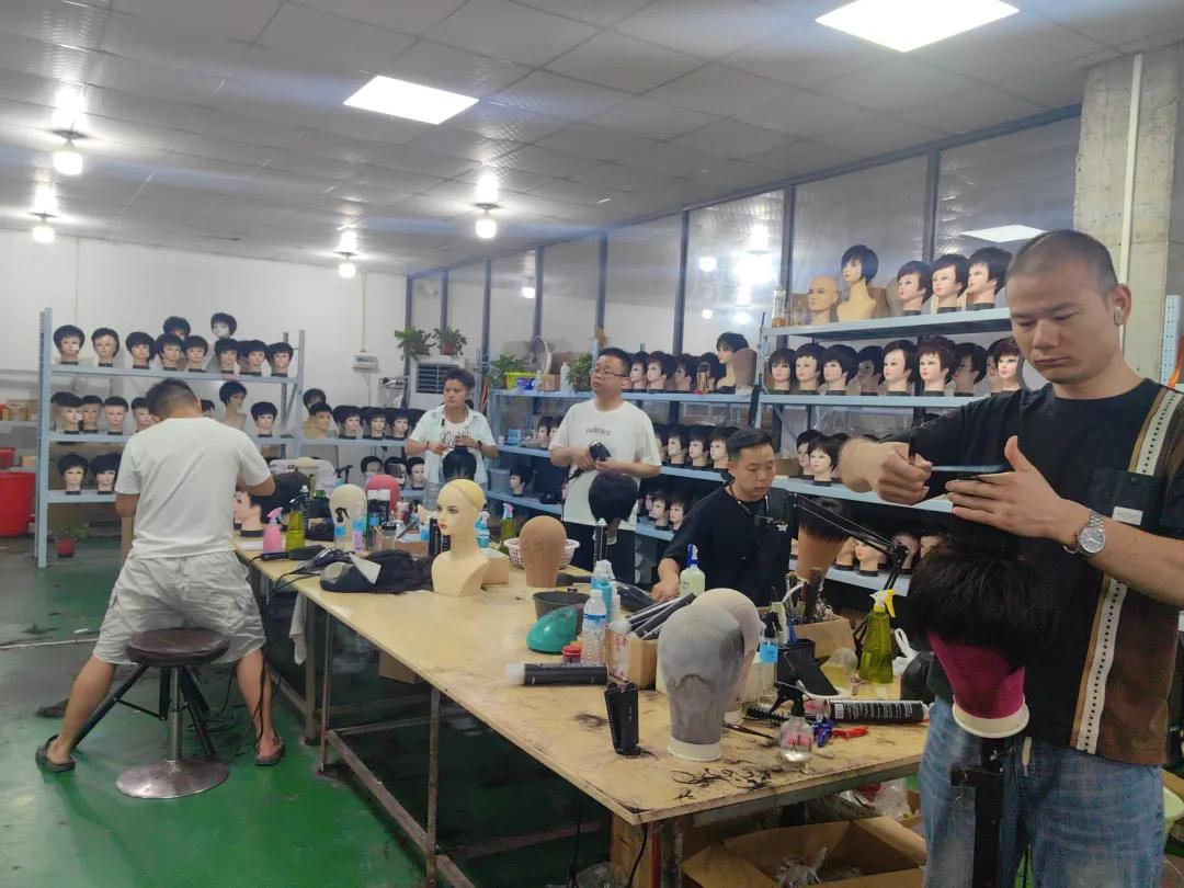在工廠裏,他們以各種姿勢站位專注爲假髮修剪造型,完成各種時尚設計。