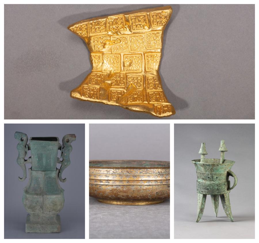 安徽楚文化博物館館藏文物依次爲:楚金幣郢爰、蟠虺紋獸耳銅方壺、東漢“元和二年”鎏金銀神獸刻紋銅舟、獸面紋銅斝。
