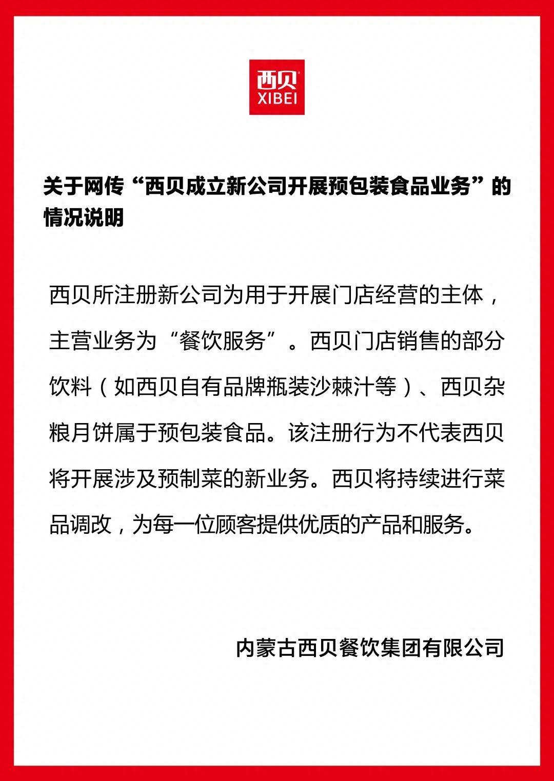 對此,西貝方面回應稱,西貝所註冊新公司爲用於開展門店經營的主體,主營業務爲“餐飲服務”。西貝門店銷售的部分飲料(如西貝自有品牌瓶裝沙棘汁等)、西貝雜糧月餅屬於預包裝食品。該註冊行爲不代表西貝將開展涉及預製菜的新業務。