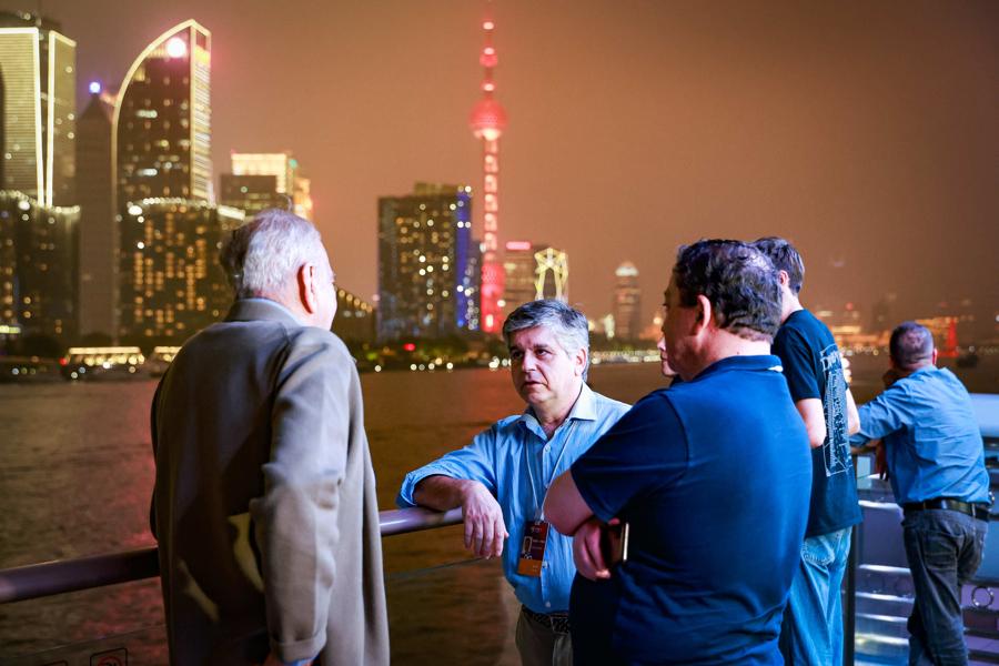 10月13日晚,第二屆世界中國學大會中外參會嘉賓登上游輪,一同欣賞浦江兩岸美景。