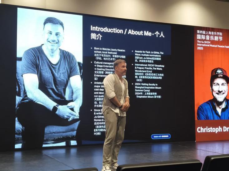 德國導演克里斯托夫·德魯伊茨(Christoph Drewitz)以自身經歷分享“本土化與國際視野結合”思路。“德國不少非商業劇場認爲音樂劇‘登不上大雅之堂’,但我覺得它本身就是美妙的藝術形式,無需與其他門類比較。”他說,德國音樂劇界2010年左右湧現一批原創劇目,近年受市場影響發展放緩,“投資人擔心原創無IP背書、缺號召力,連2018年獲獎的《洛特》(Lotte)都難復排。”