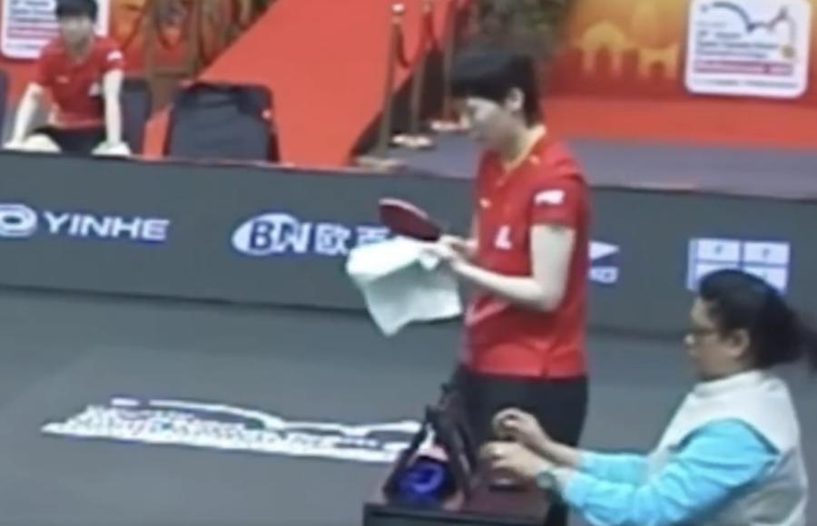 王曼昱用乾毛巾屢屢擦拭球拍