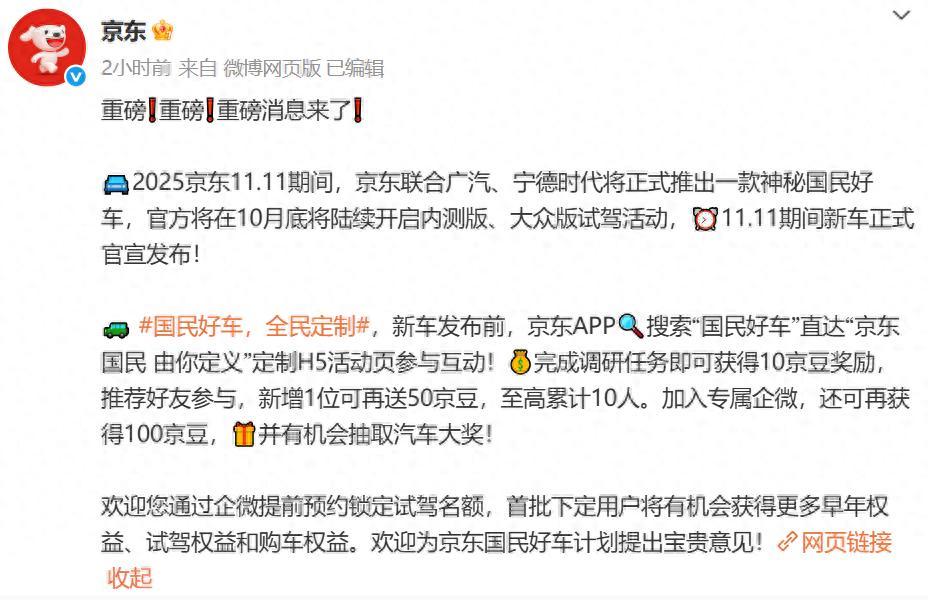 京東官方微博10月14日消息,2025京東11.11期間,京東聯合廣汽、寧德時代將正式推出一款神祕國民好車,官方將在10月底將陸續開啓內測版、大衆版試駕活動,11月9日新車正式官宣發佈。