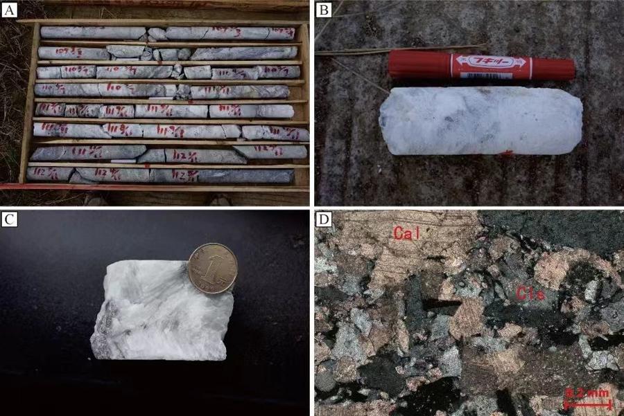 麻山頭鍶礦區天青石礦石照片(A,B,C—礦石照片,D—鏡下照片,Cal—方解石,Cls—天青石)。