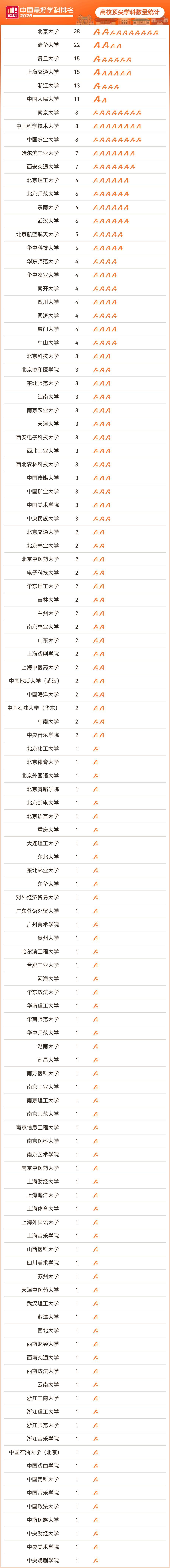一批非“雙一流”高校憑藉其在特色領域的突出表現,也有學科進入中國頂尖行列。上海戲劇學院有2個頂尖學科,北京舞蹈學院、北京語言大學、廣東外語外貿大學、廣州美術學院、華東政法大學、南方醫科大學、南京工業大學、南京藝術學院、山西醫科大學、四川美術學院、西南政法大學、浙江工商大學、浙江理工大學、浙江師範大學、浙江音樂學院、中國戲曲學院、中南民族大學這17所高校各有1個頂尖學科。