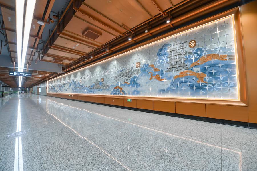 30米長的“蟠龍十景”公共藝術牆是站廳的“文化靈魂”。設計團隊從《蟠龍鎮志》中提取“江村野店、曲水縈居、柳榆晚照”等十大景緻,採用激光雕刻瓷片呈現輪廓,鐫刻於藝術牆長卷之上,通過水刀切割的瓷片拼合形成古鎮肌理,瓷片縫隙則暗藏嵌入式LED燈帶,燈光亮起時如繁星閃爍、似波光流轉,碰撞出時空褶皺,帶給乘客“一步一景、一時一境”的沉浸式體驗,彷彿“一步穿越千年”,實現歷史文化與當代藝術的生動對話。