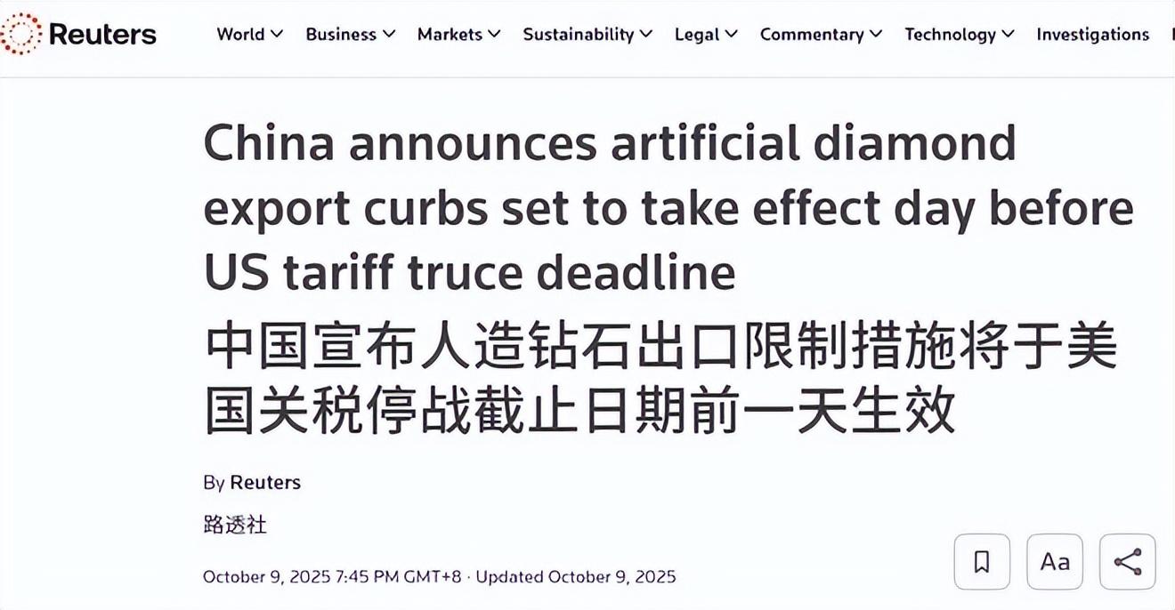 中國此次出手管制人造鑽石出口,被廣泛視爲對美國技術封鎖的反制措施。