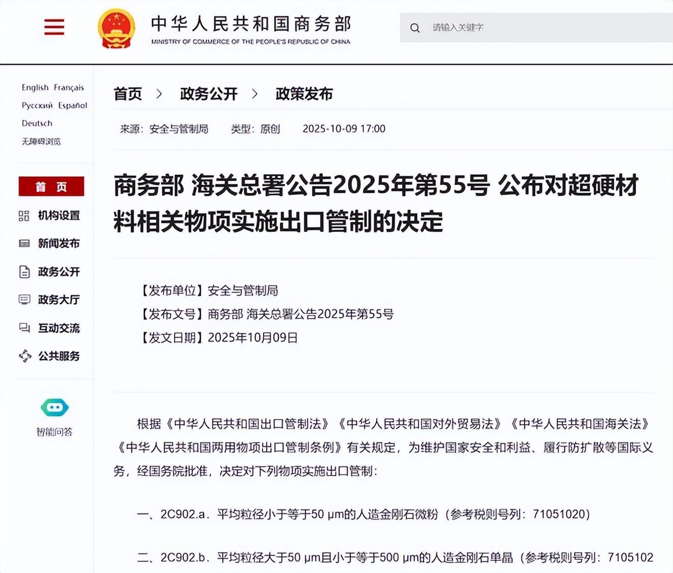 今年10月9日,中國對超硬材料相關物項實施出口管制,公告詳細列出了包括人造金剛石微粉、單晶、線鋸、砂輪以及關鍵生產和工藝技術在內的六類受控物項。