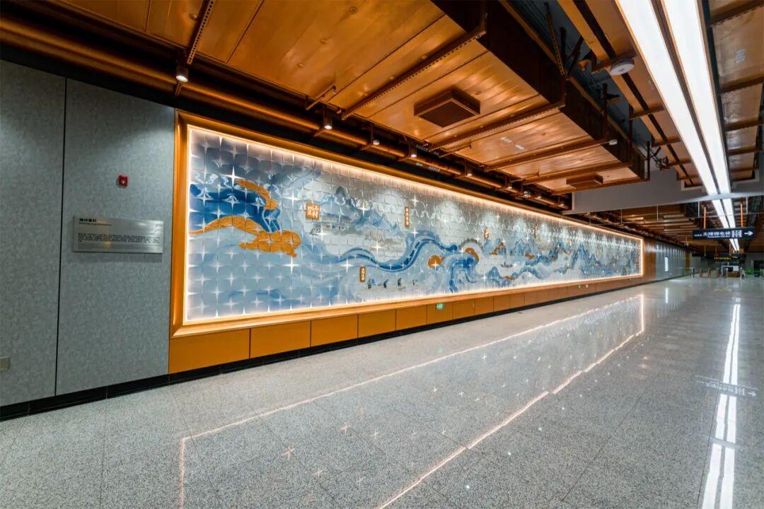 30米長的“蟠龍十景”公共藝術牆是站廳的“文化靈魂”。設計團隊從《蟠龍鎮志》中提取“江村野店、曲水縈居、柳榆晚照”等十大景緻,採用激光雕刻瓷片呈現輪廓,鐫刻於藝術牆長卷之上,通過水刀切割的瓷片拼合形成古鎮肌理,瓷片縫隙則暗藏嵌入式LED燈帶,燈光亮起時如繁星閃爍、似波光流轉,碰撞出時空褶皺,帶給乘客“一步一景、一時一境”的沉浸式體驗,彷彿“一步穿越千年”,實現歷史文化與當代藝術的生動對話。
