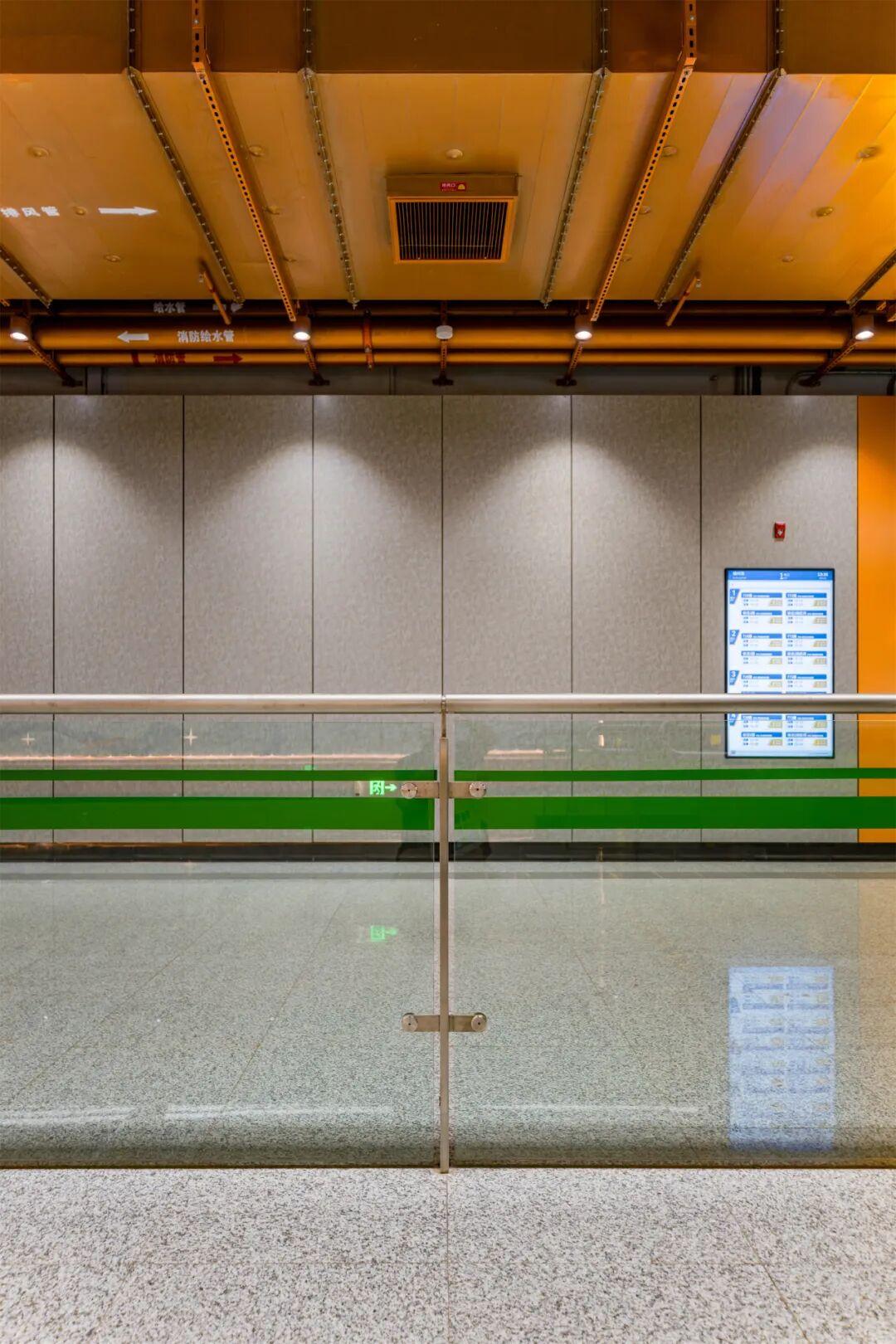 第三,設計更具人文關懷。衛生間通過結構降板實現蹲便器與地坪齊平,第三衛生間配備無障礙扶手與嬰兒護理臺,緊急呼叫系統聯動客服中心。人防門門檻與地面齊平,加裝不鏽鋼花紋板,方便推嬰兒車或拉行李箱的乘客通行。出口旁邊設計了公交信息屏等。