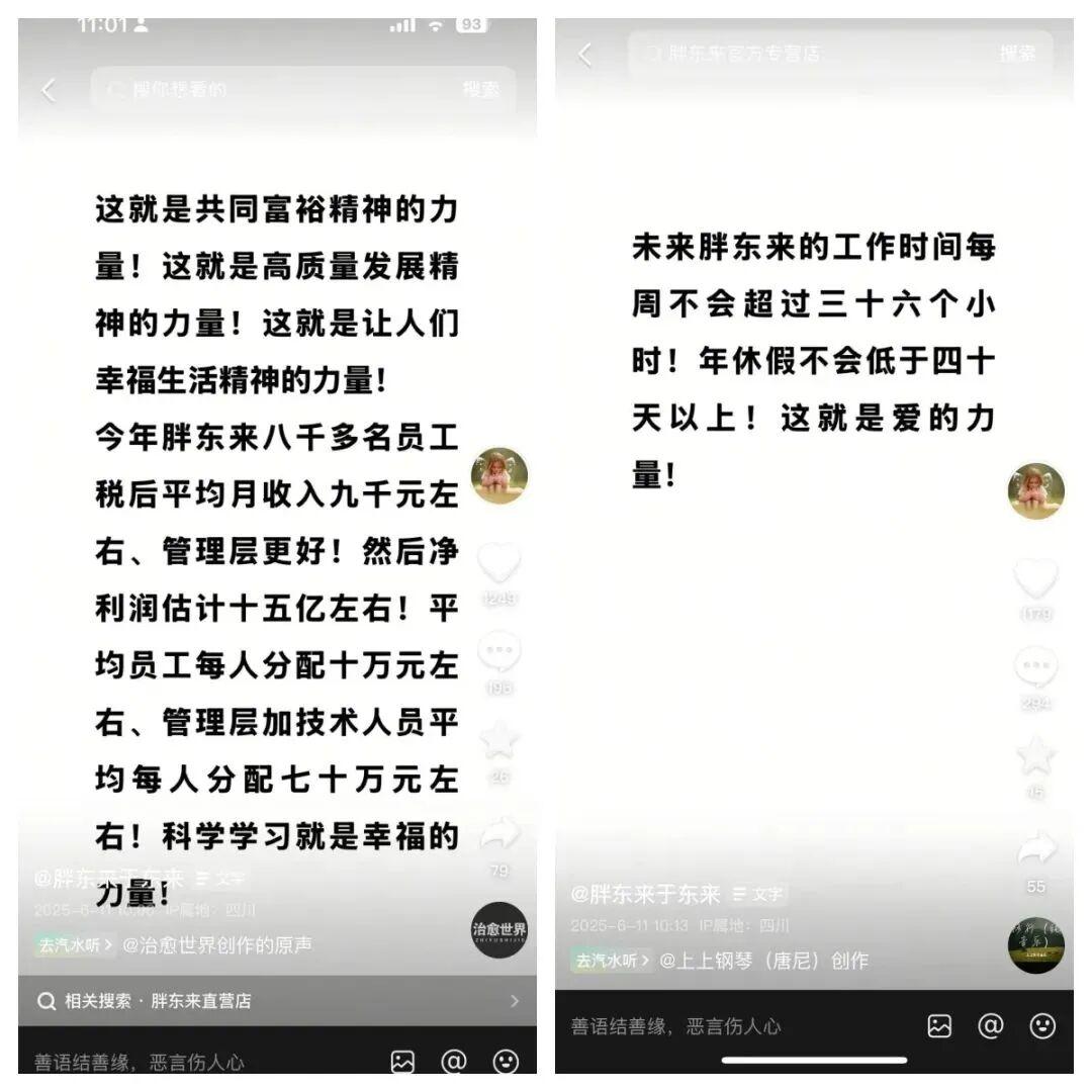 6月11日,於東來在其抖音賬號宣佈:今年胖東來八千多名員工稅後平均月收入九千元;淨利潤估計十五億左右,平均員工每人分配十萬元,管理層加技術人員平均每人分配七十萬元。