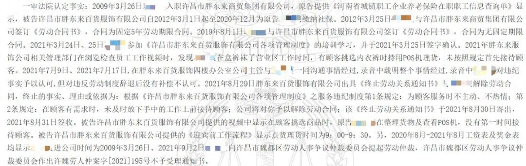 近日,記者從中國裁判文書網獲悉,許昌市胖東來百貨服飾有限公司(下稱“百貨服飾公司”)一員工因“未按照規定首先接待顧客”,被公司認定爲嚴重違紀並解除勞動合同。該員工隨後提起訴訟,河南省許昌市兩級法院審理後均認定公司解除合同合法,駁回了其賠償請求。