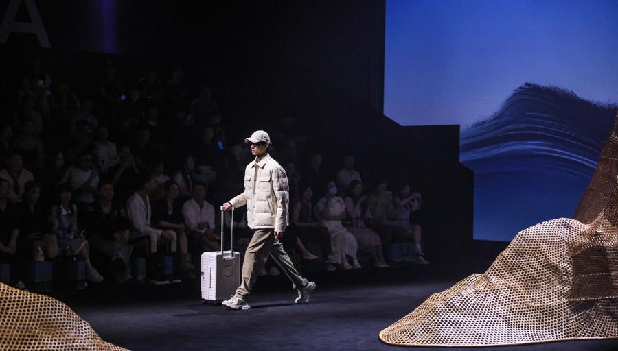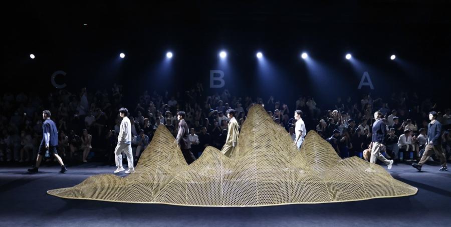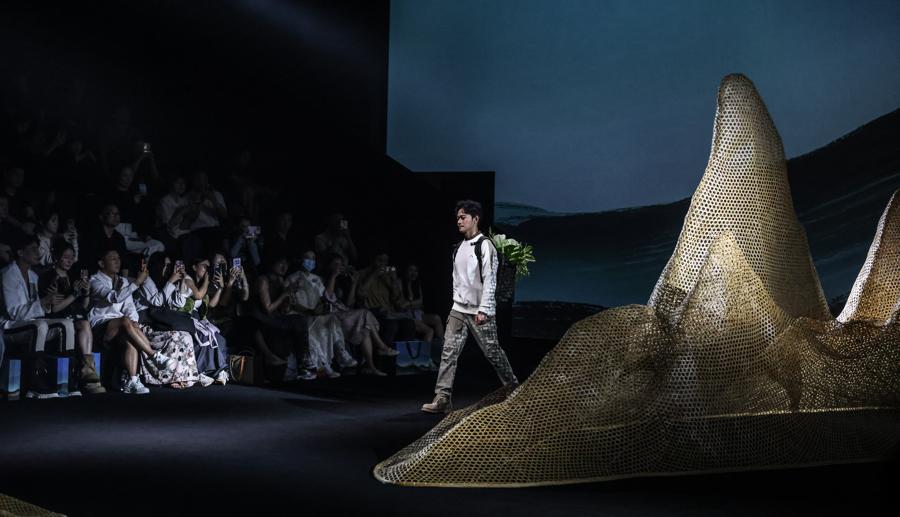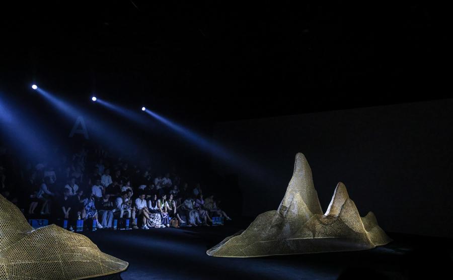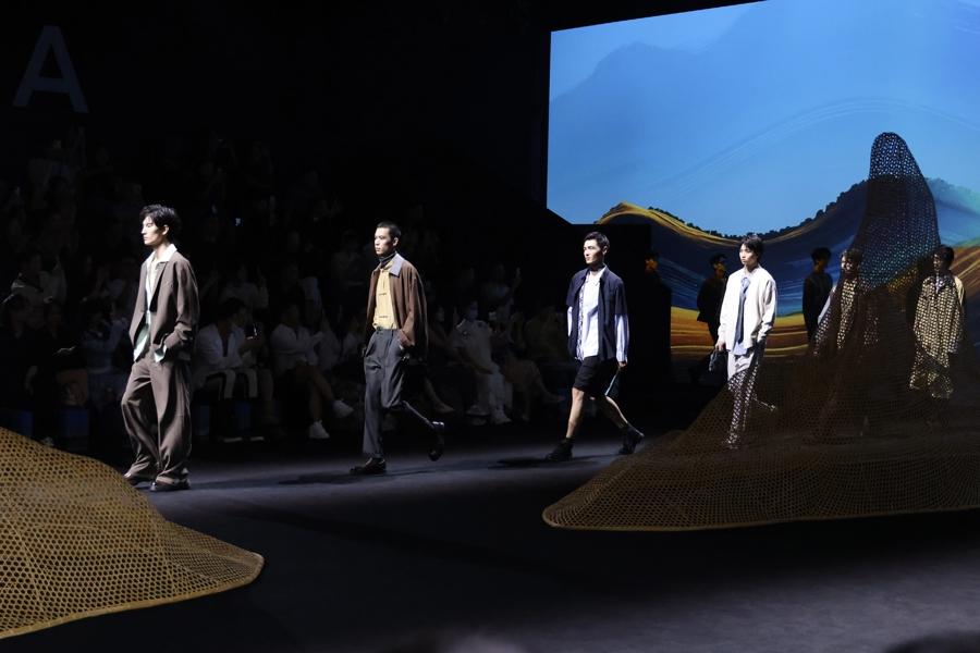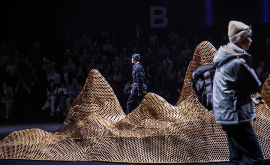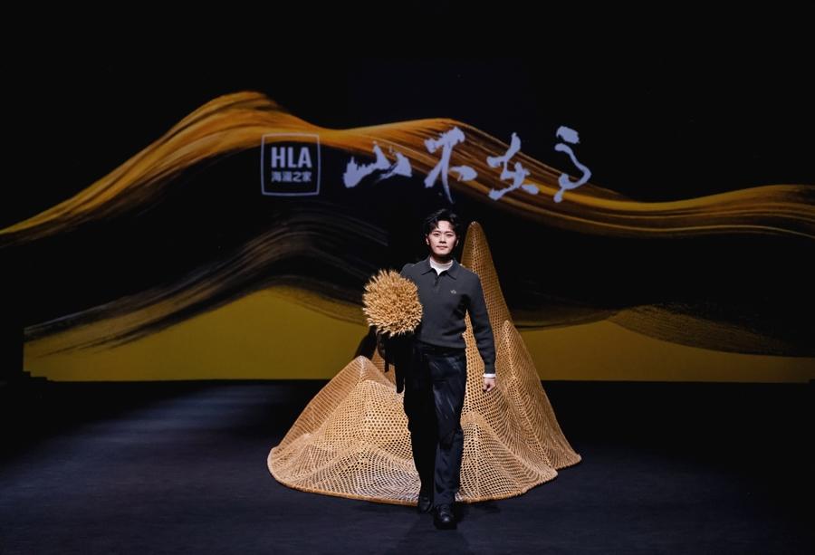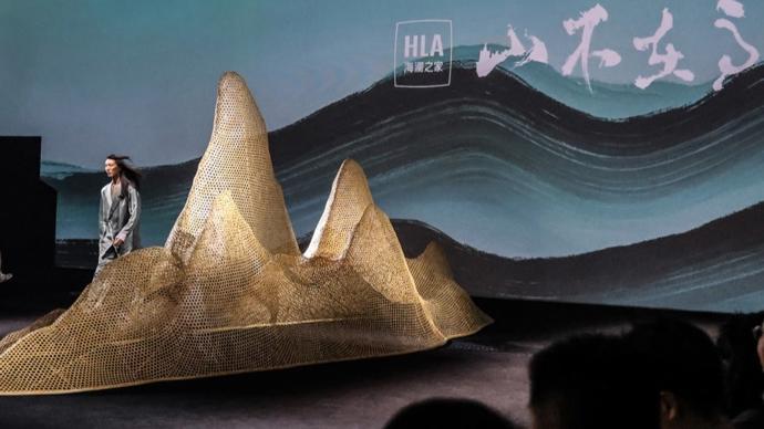 記者在現場看到,秀場中央由非遺竹編藝術家宋亮亮爲海瀾之家“山不在高”量身打造的藝術裝置引人注目。他以極具現代感的流線型編織手法,將傳統竹藝化爲一座靈動的“山形”結構,在秀場空間呈現出疏密有致的東方畫境。燈光穿過竹編縫隙,在秀場地面投下斑駁光影。模特們身着大秀系列服飾款款走來,與此裝置遙相呼應,讓古老的手工藝在當代時尚語境中煥發全新的生命力。