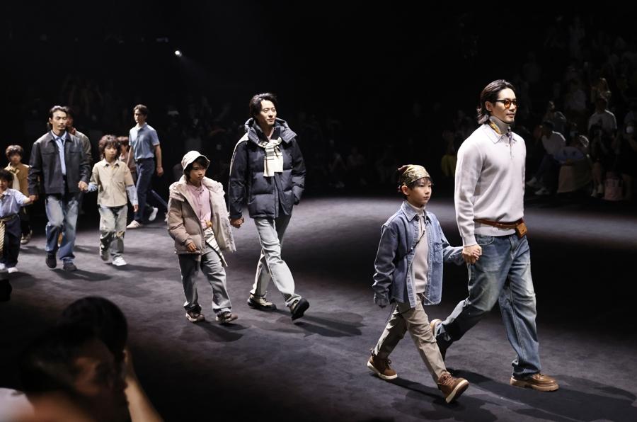 在大秀的最後環節,多對父子與模特同臺走秀,充滿溫情與力量,在T臺上他們以自然真摯的互動,將“父愛如山”的厚重主題化作可感可觸的時尚敘事。童裝設計的活潑靈動與成人男裝的沉穩包容相得益彰,父子並肩而行,步伐間流露的默契與溫情,讓整場大秀的情感層次更爲豐富。