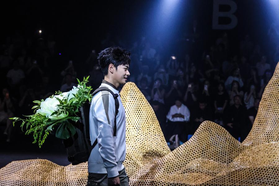 圖爲在“春山覺醒”環節,曹駿以米色衛衣與卡其色傘兵褲的休閒搭配悠然亮相,衣身點綴精緻的“山不在高”LOGO刺繡,肩上的竹編花簍中,萌動的綠意隱喻新生與希望。他步履從容穩健,儀態自然舒展,展現出東方文人儒雅而不失力量的風範。