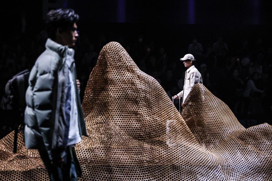 圖爲秀場中央,由非遺竹編藝術家宋亮亮爲海瀾之家“山不在高”量身打造的藝術裝置尤爲引人注目。他以極具現代感的流線型編織手法,將傳統竹藝化爲一座靈動的“山形”結構,在秀場空間呈現出疏密有致的東方畫境。