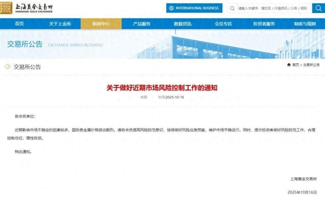 針對近期國際貴金屬價格波動劇烈,上海黃金交易所10月16日向各會員單位發佈關於做好近期市場風險控制工作的通知。