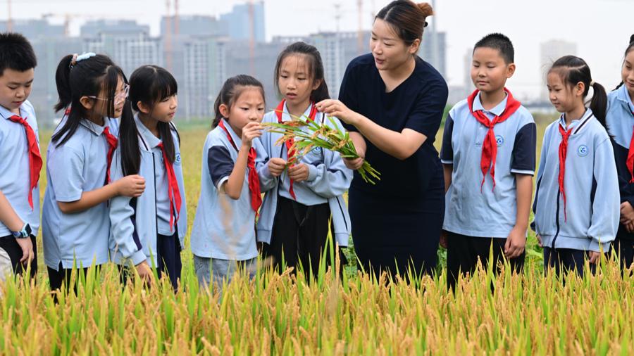 江蘇省太倉市港城小學老師爲孩子們講解水稻生長知識。 | 新華社發