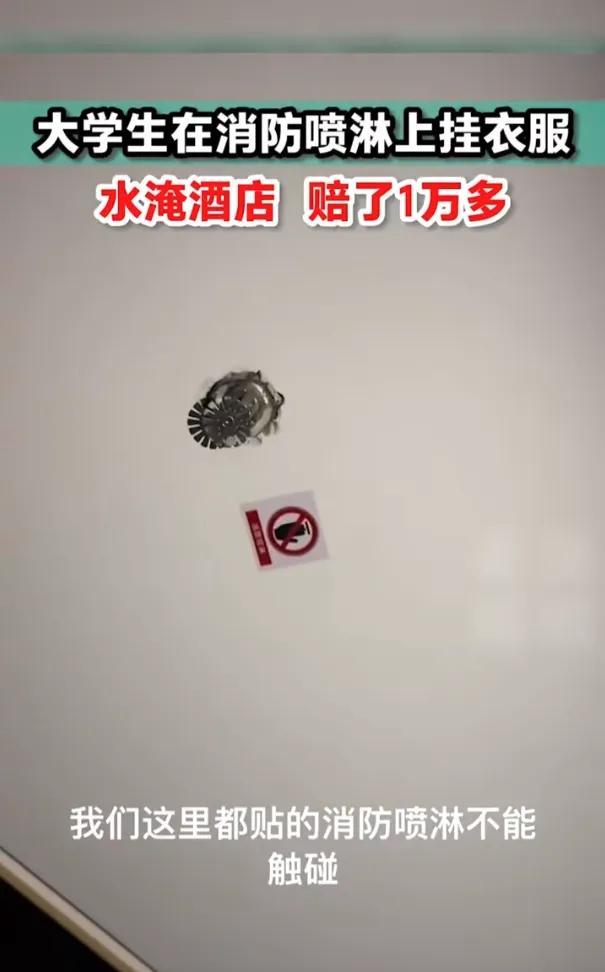2023年5月,遼寧大連,一名大學生住酒店時在消防噴淋頭上掛衣服,導致水淹客房,客房內的電器、傢俱全被泡水。大學生最終賠償損失費1萬多元。