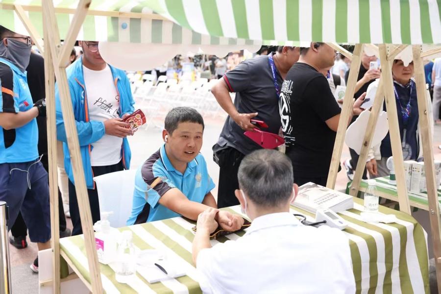 進入啓動儀式後的“全域友好服務”環節,現場化身充滿活力的“城市騎士節”。綜合表演區裏,魔術、小丑、歌唱節目輪番上陣;趣味遊戲區內,套圈、敲鑼、對對碰等互動活動讓大家笑聲不斷;而最受歡迎的綜合服務區——“暖‘新’服務站”,則匯聚了17家區域化黨建單位,爲騎手們提供黨務諮詢、健康義診、金融反詐、非遺美食、免費理髮等多樣服務。