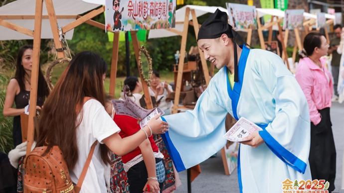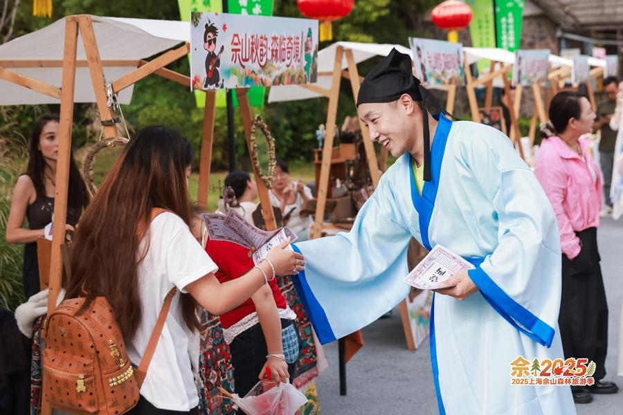 在視覺體驗方面,“秋韻藝術季”精彩不斷。遊客不僅能參與森影打卡、尋找隱藏角色“佘小雅”合影、體驗草木拓印手工,還能沉浸式參與“徐霞客佘山謎蹤”NPC 互動解謎。在景區內偶遇“徐霞客”NPC併成功完成互動任務後,遊客可獲得專屬“霞客銀票”,集齊銀票可前往松江印象城、萬達廣場、佘山旭輝裏、寶樂匯等合作商業體兌換專屬消費優惠。此外,活動創新引入“移動美術館大巴”,將精選藝術展覽從室內移至佘山森林,讓遊客在自然環境中零距離欣賞優質藝術資源,實現生態意趣與美學薰陶的完美融合。
