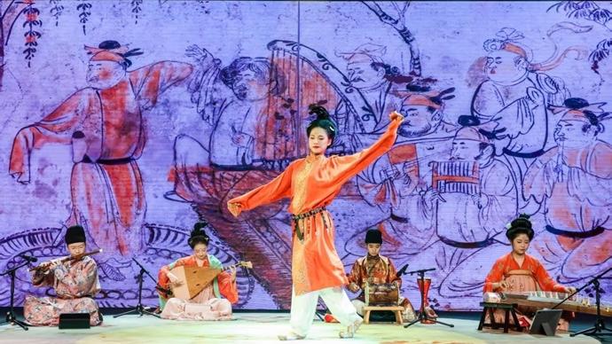 胡騰舞躍動應鼓,羯鼓疾奏相和;琵琶聲如金石裂空,映照西域流光。古琴、箏、笛等樂器交織共鳴,匯聚成一場跨越千年的音樂對話。演出以復原古樂器與古譜爲特色,演奏者以精湛技藝重現唐樂風華,引領觀衆步入那個兼容幷蓄、氣象萬千的時代。