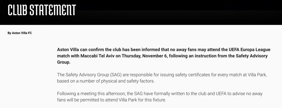 10月16日,阿斯頓維拉俱樂部官方宣佈,11月6日歐聯杯聯賽階段第四輪主場對陣以色列特拉維夫馬卡比一戰,將不允許客隊球迷入場。阿斯頓維拉在聲明中表示,這一禁令由負責主場維拉公園球場賽事安全許可的“安全諮詢小組(SAG)”決定。