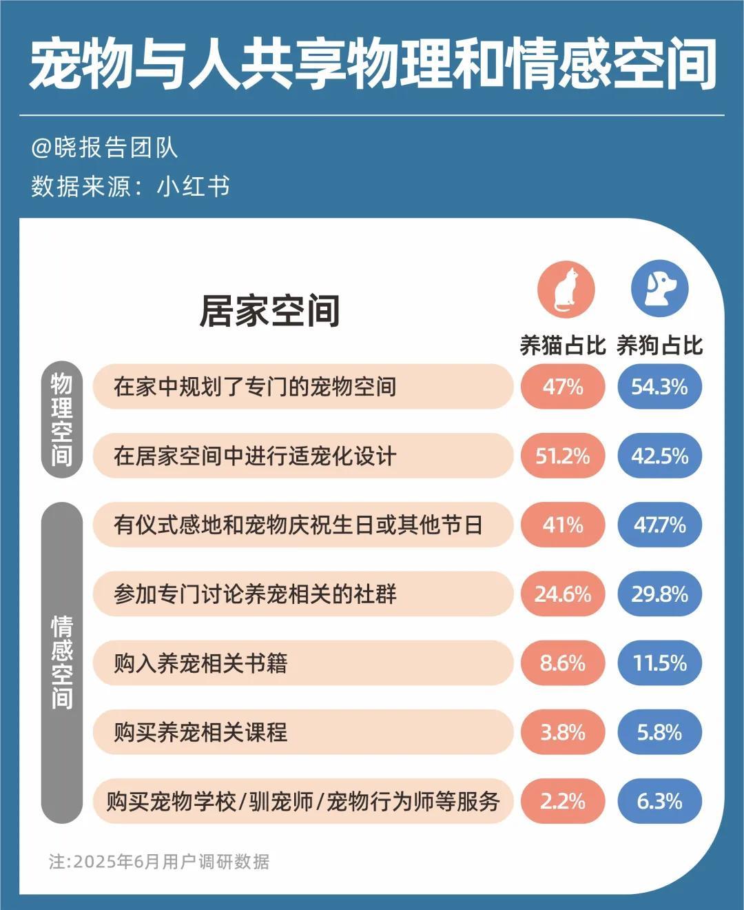 根據小紅書用戶調研數據,54.3%的養狗家庭會爲寵物規劃專屬區域,51.2%的養貓家庭則在裝修階段便融入適寵設計。