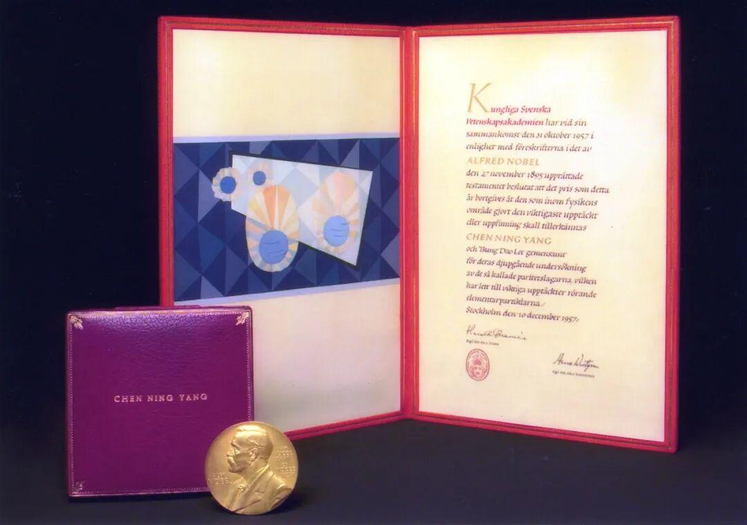1957年楊振寧自瑞典國王手中接受諾貝爾獎章、諾貝爾獎章與獎狀