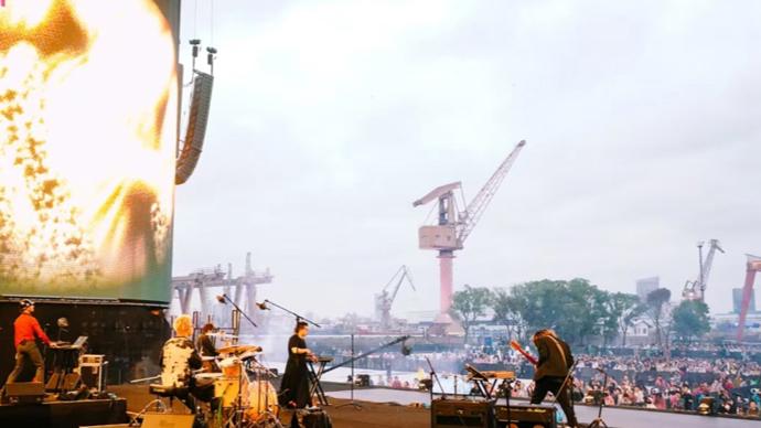 鏽跡斑斑的龍門吊、粗糲的水泥地面,之間是充滿未來感的舞臺設計、機械藝術裝置。年輕人鍾愛的潮流音樂與在地的工業風形成迴響。今明兩天,復興島又迎來一場高能級活動——乾杯音樂節登陸船臺PARK,陪伴樂迷從白天嗨到黑夜。