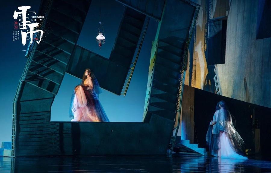 多媒體光影設計交錯鋪陳,打破時間與空間邊界,將多維“雷雨”時空拋入觀衆視線。服裝在保留西裝、旗袍、長衫等年代服飾的廓形或樣式基礎上,融入編織、薄紗等元素,強化角色氣質與時代質感的融合。