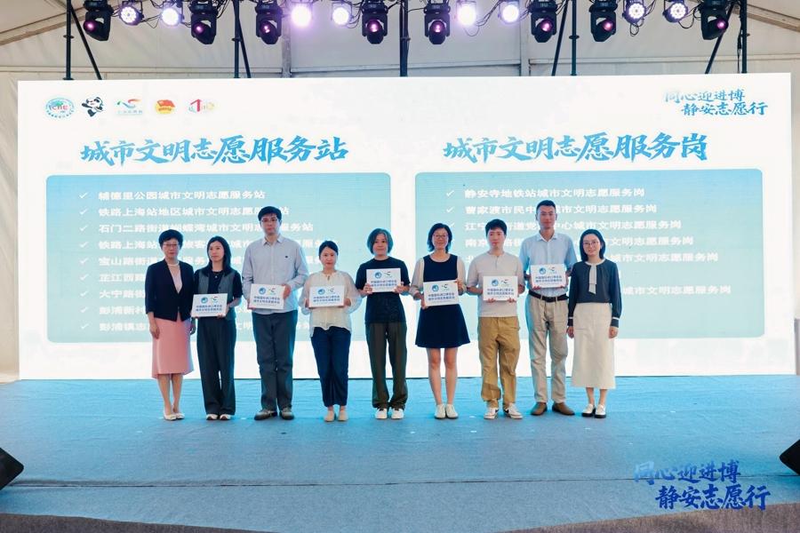 現場,爲第七屆進博會優秀志願服務集體、優秀志願者頒發榮譽證書;爲鐵路上海站、輔德里公園、重點商圈等第八屆進博會城市文明志願服務站(崗)授牌;靜安區進博會內賓接待“藍精靈”志願服務隊上崗宣誓,用激情昂揚的誓詞,生動詮釋新時代青年志願力量。