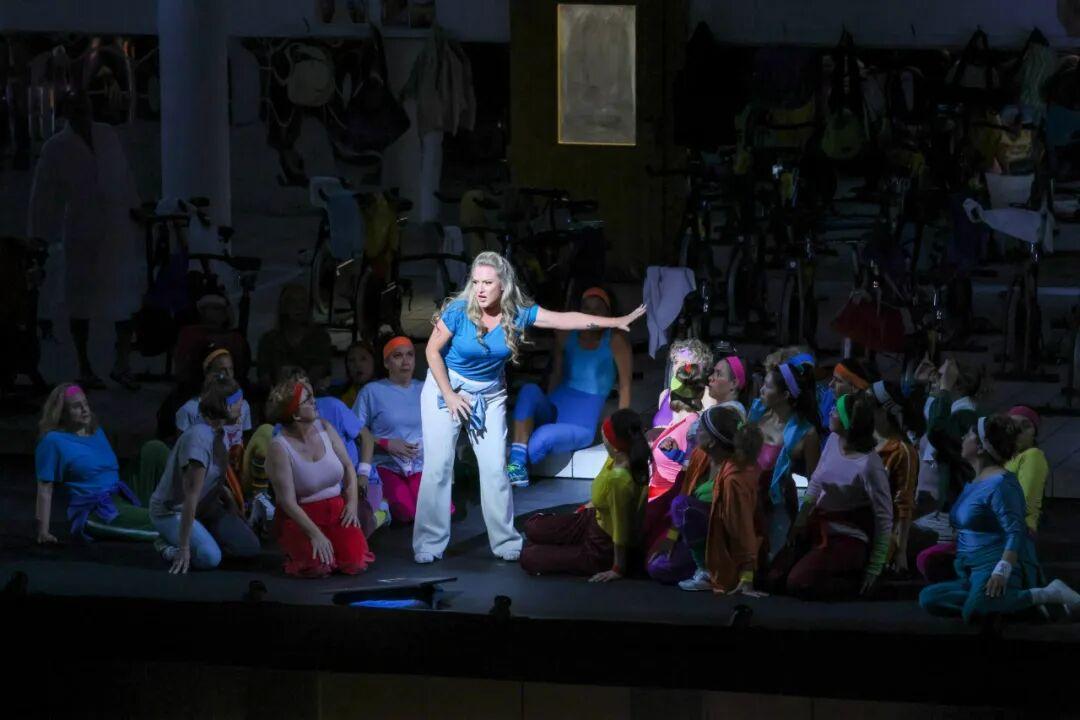 第二幕原劇場景是紡車房,當舞臺呈現燈光明亮的健身房,一衆女子邊唱邊蹬着動感單車,令人眼睛一亮,情緒爲之一振。據說紡車與動感單車,在德語裏本是同源,導演巧妙地運用這一點,銜接傳統與現代,由此點明森塔是一位現代特質女子(這爲結尾的引爆埋下了伏筆)。第二幕森塔身着現代服裝、手持荷蘭人畫像出場(表明她對荷蘭人的愛已經嚮往已久)。在森塔與曾經的戀人埃裏克發生爭執後,荷蘭人被森塔父親達蘭德帶進健身房。森塔與荷蘭人一見鍾情(因爲之前雙方已經心戀)。荷蘭人從手提箱中拿出一件象徵傳統的禮服套在森塔身上,森塔戴上象徵婚紗的頭巾,兩人互相擁抱,激情歌唱,彼此夢想成真,愛情達到高潮。