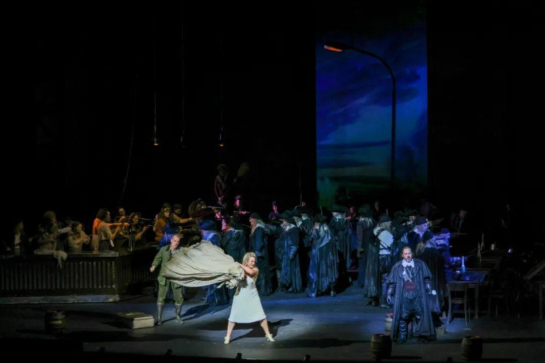 這次《荷蘭人》的卡司陣容可觀。飾演男主角荷蘭人的是英國男中音克里斯托弗·馬爾特曼,說來真巧,我今年六月去德國西北部的音樂之旅,其中一站在漢堡國家歌劇院觀賞理查·施特勞斯《莎樂美》,飾演男主角約翰的就是這位馬爾特曼。那也是一個新制作,導演要求馬爾特曼在不少場景需背對觀衆演唱,儘管如此,馬爾特曼反射的嗓音依然厚實堂皇,如黃鐘大呂,如此出色的唱功令我對他此番在上海演唱荷蘭人充滿期待。果然不負所望,馬爾特曼一開場就用醇厚飽滿的嗓音,唱出了荷蘭人的孤獨感和對愛情的期盼嚮往。第二幕當他得到森塔的愛情,他的演唱又充滿溫情和喜悅。第三幕對森塔誤會而決絕時,他的絕望感又是那麼的撕心裂肺,既讓人同情,又令人無奈。馬爾特曼豐富的音色、音量變化和富有磁性質感的爆發力,令角色充滿魅力。愛爾蘭女高音西妮德·坎貝爾·華萊士飾演的森塔,嗓音明亮、通透、圓潤、溫暖,兼具戲劇張力,塑造了一位既一往情深又具獨立性格的女性,她在第二幕演唱的思念荷蘭人的敘事曲以及後面與荷蘭人的愛情二重唱,聲情並茂,音色華美,深情感人,把全劇推向情感高潮。第三幕中她的愛憎分明、絕望噴發,也表達得淋漓盡致,充滿戲劇張力。