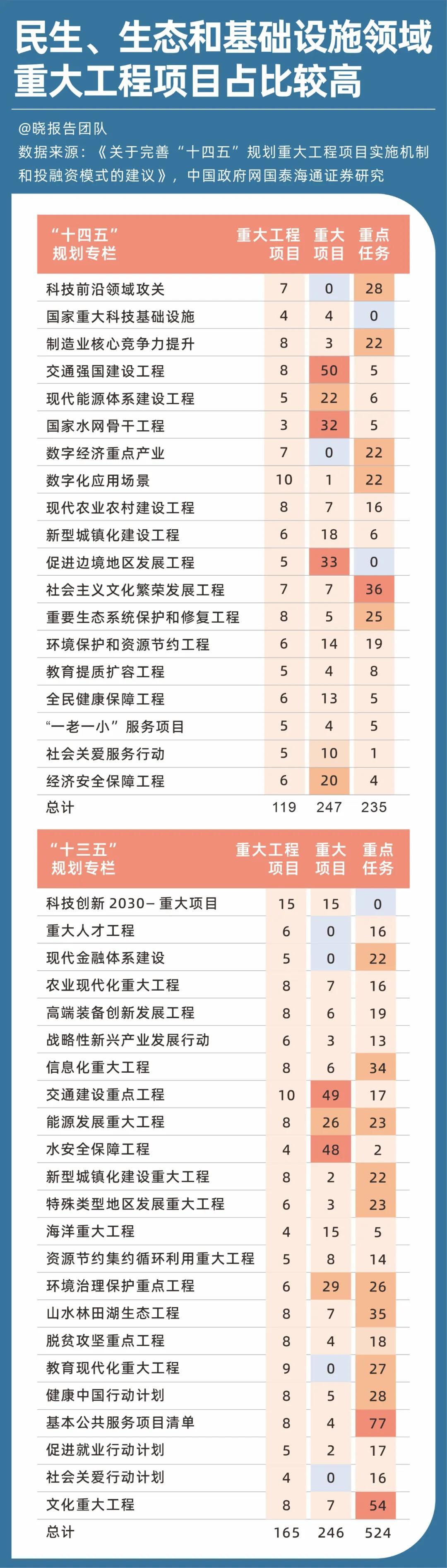 而從“十三五”到“十四五”的趨勢來看,“兩重”項目中民生、生態和基礎設施領域項目佔比較高,未來的“十五五”或將延續這種趨勢——這也是“集中力量辦大事”的生動體現。