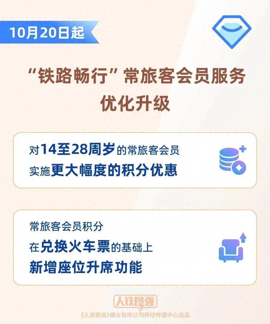 10月20日起,中國國家鐵路集團有限公司將優化升級“鐵路暢行”常旅客會員服務,對14至28週歲持居民身份證、港澳臺居民居住證、港澳居民來往內地通行證、臺灣居民來往大陸通行證、外國人永久居留身份證的常旅客會員實施更大幅度的積分優惠,會員積分在兌換火車票的基礎上,新增座位升席功能,常旅客會員積分的應用場景進一步拓展,旅客將獲得更多實惠,有利於激發“鐵路+”消費潛力,促進人員流動和沿線經濟發展,爲全面擴大內需注入新動能。