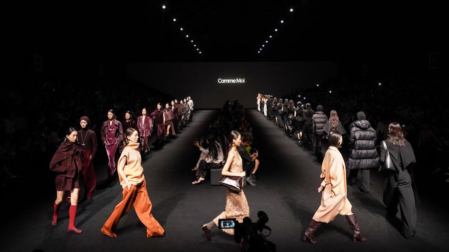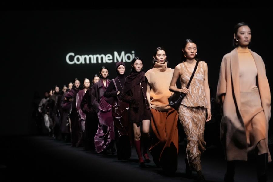 COMME MOI本次於上海時裝週期間發佈的2025秋冬系列,以“日落餘暉”爲主題,採用柔和粉橙、酒紅等色調,結合亞麻、真絲等天然材質,通過漸變印花、鏤空立體印花等工藝展現服飾肌理。COMME MOI希望通過服裝傳遞給女性的生活信念。