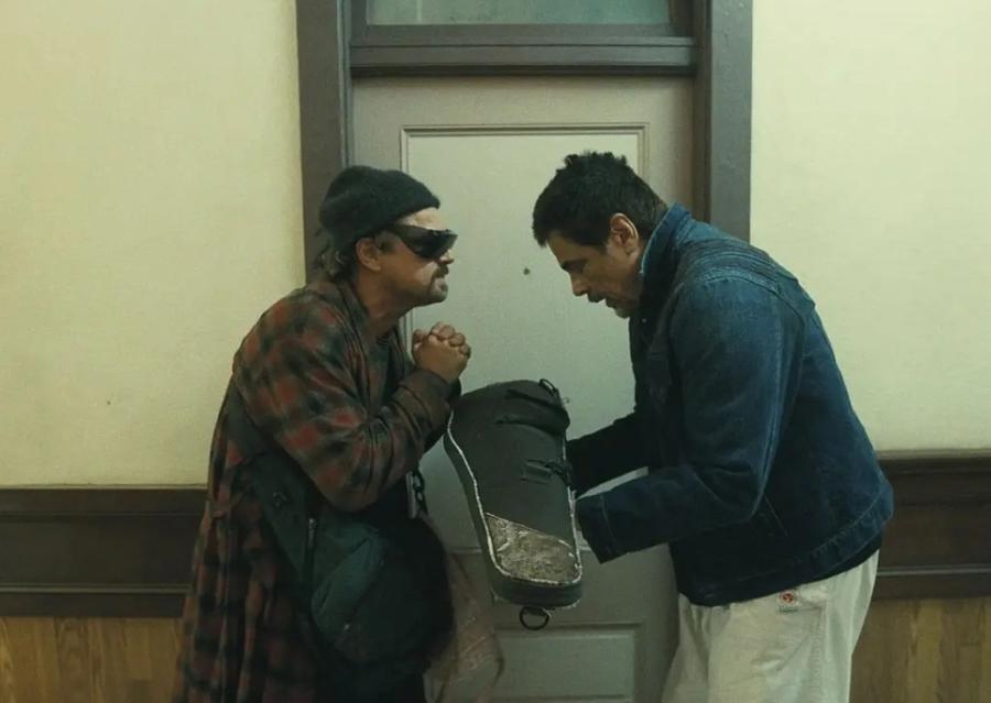 讓超級巨星膚淺地扮演笨笨的小人物,甚至在逃命時候誇張地從屋頂上摔了下去,這不僅是反差的諧謔鬧劇,逃亡主題的公路喜劇把原本不會有交集的、割裂的小世界串聯起來——有渴望革命卻不愛具體的人們的理想主義者,有操控他人命運的老白男既得利益羣體,有既是教練又是“教父”的大家長力所能及地庇護弱者,形形色色的隱祕社團組成關於這個時代的光怪陸離的拼圖。這是一個複雜且含混的世界,但藏在攝影機後面的說書人的口吻是輕盈灑脫的,就像墨西哥少年踩着滑板一腳蹬出一個街區。攝影機的鏡頭何其自由地穿梭在看起來是平行宇宙的不同人間,深入羣衆的激進革命分子藏在貧民窟的深處,西班牙裔的跆拳道教練在雜貨店的地下給墨西哥移民們創造了親密的收容所,掌握權力和金錢的老白男們聚會時同樣像不能見光的鼴鼠躲在最深的地庫,人間運轉的真相是花樣百出的“祕密”。