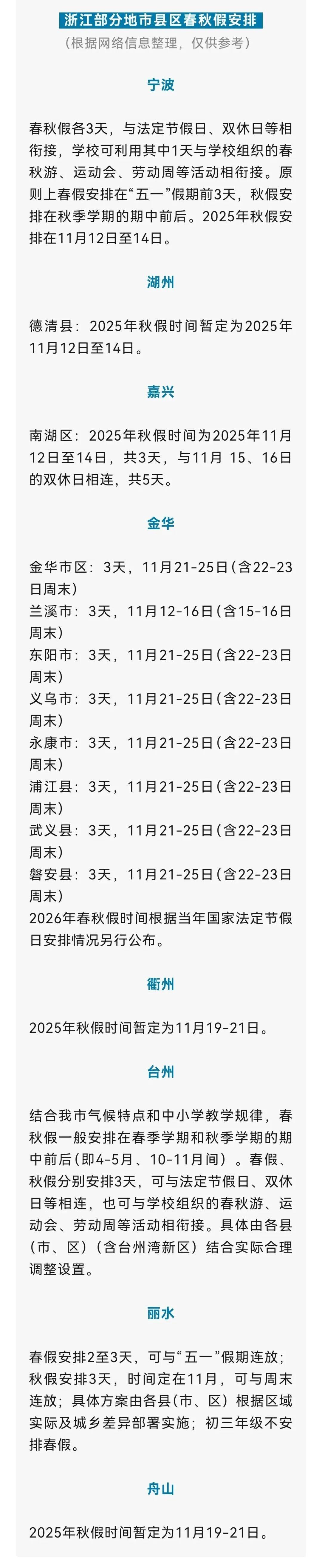 浙江省的衢州2025年秋假時間暫定爲11月19日至21日,與週末的22日、23日銜接,形成5天假期;金華(除蘭溪)秋假時間普遍安排在11月21日至25日,同樣是與11月22日、23日的週末銜接,形成5天假期。