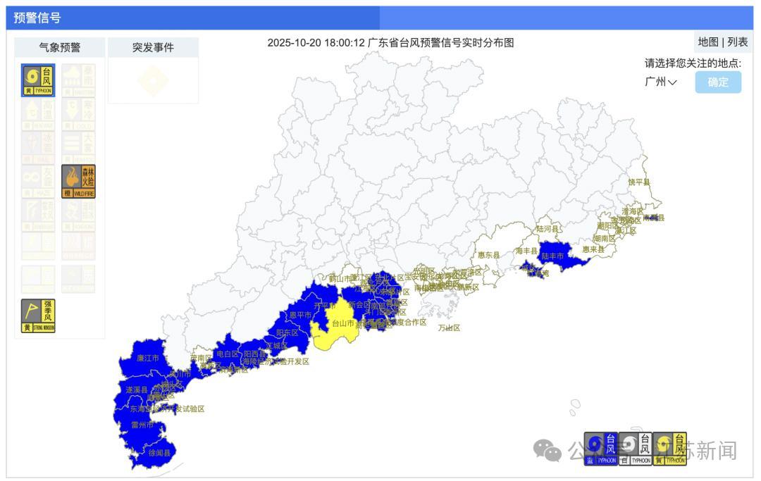 廣東臺山市氣象臺20日17時13分將川島鎮臺風藍色預警信號升級爲代表“停課信號”的黃色,其餘鎮街颱風藍色預警信號繼續生效。截至20日18時,除江門台山外,江門其他區域、湛江、茂名、陽江、珠海、中山、汕尾、汕頭等地,有市縣區颱風預警信號最高發布至藍色;深圳、惠州、揭陽、潮州,有市縣區颱風預警信號最高發布至白色。
